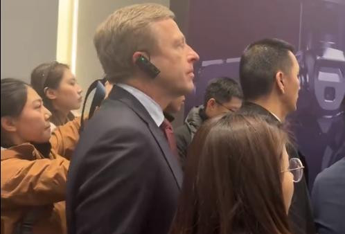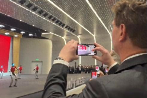 访问期间,现场氛围轻松活跃,上演了趣味一幕:宝马集团董事长齐普策为看清机器人,主动踮脚探头、近距离观望;奔驰集团董事会主席康林松则拿起手机,拍摄机器人表演画面分享给家人。