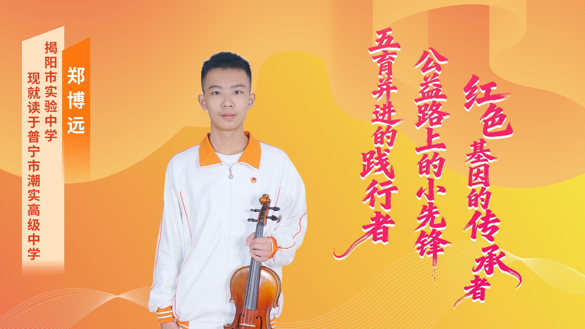 郑博远,普宁市潮实高级中学高一学生。他品学兼优,学习成绩持续多年名列年级前茅,在科技创新、文体活动、志愿服务等领域均展现出卓越的综合素养。在2025年揭阳市初中数学和化学学科能力展示活动中均获市级一等奖,并先后荣获“广东省红领巾奖章个人四星章”“揭阳市最美南粤少年”“揭阳市三好学生”“揭阳市优秀少先队员”等多项荣誉,2025年入选广东“新时代好少年”先进事迹发布名单。