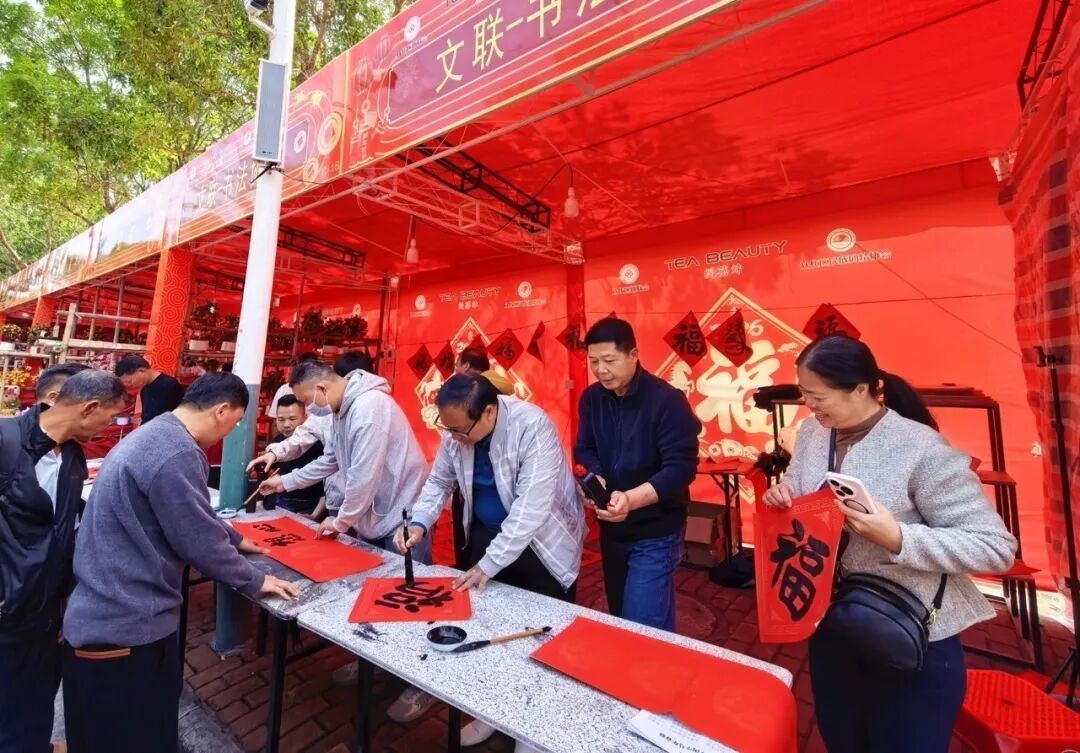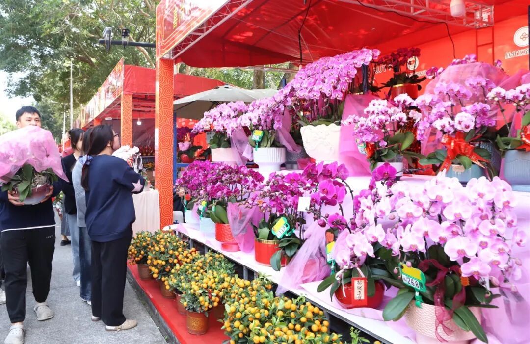 花市主干道上,年桔、蝴蝶兰、金桔树等年花争奇斗艳,挥春摊位前,书法家挥毫泼墨,“马到成功”“龙马精神” 等春联供不应求。美食区的牛杂、糖画、从化特色小吃香气四溢,不少市民一手捧着小吃,一手提着年花,脸上满是笑意。